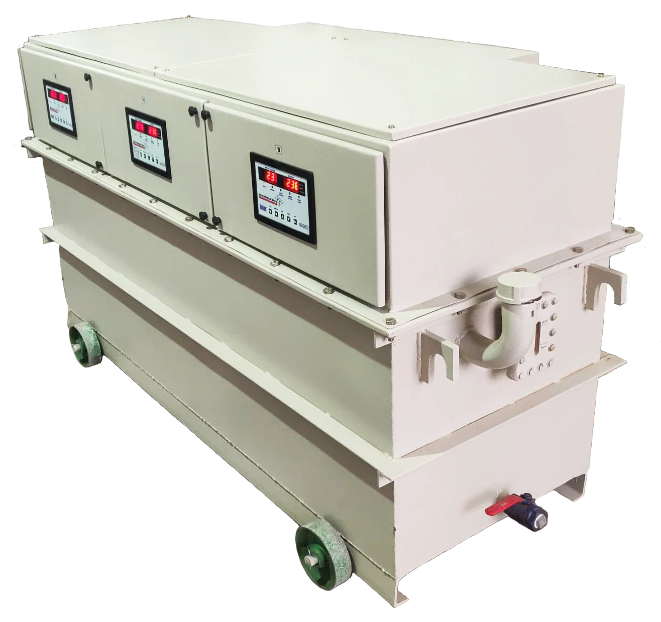 The primary voltage of the Buck Boost Transformer is regulated by adjusting the position of the moving arm of the auto transformer, facilitated by the motor. This arrangement allows for precise control over the addition or subtraction of line voltage.